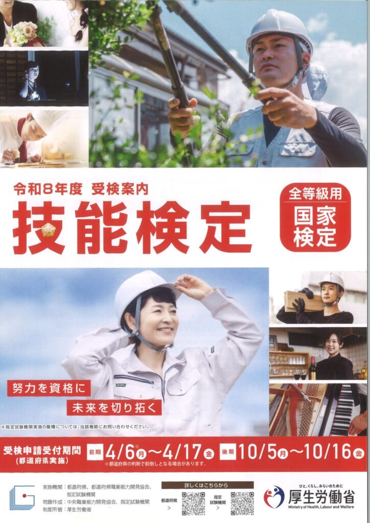 4月6日より「令和8年度技能検定」の受験申請受付が始まります。受付は4月17日までの短い期間となっておりますのでご注意下さい。受験申請用紙は宮城県職能力開発協会・ハローワーク等にて受取れますが、当協会にも幾らか用意しております。